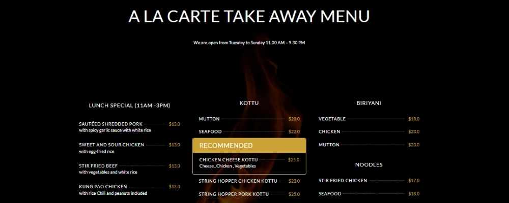 • Enhanced Online Presence: Built a modern website that reflects the restaurant’s stylish, contemporary Sri Lankan dining experience.